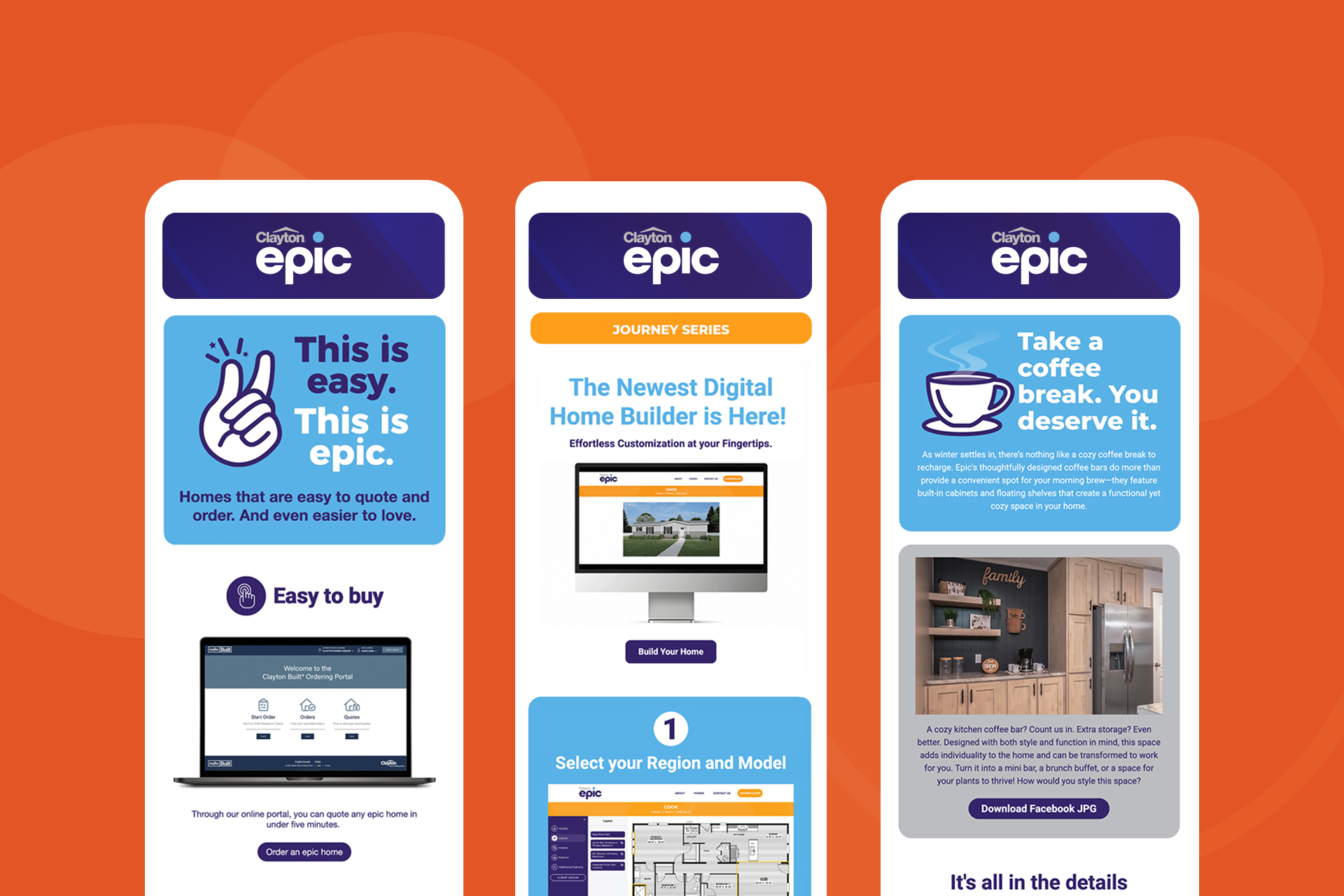 Clayton is a very (very) large company. So their first audience is always internal. Our messaging strategy included a simple acrostic, attaching the epic name directly to the collection’s top benefits and selling points for Clayton and independent retailers. From there, employing an easygoing tone of voice allowed us to grease the wheels, bringing the new brand to life through an internal email campaign, and beyond. The whole idea was to keep things easy. So the emails stayed friendly, focused, and free of fluff, keeping useful info people might actually remember at the top of their inbox. We kept coming back to clarity and simplicity, whether directly or between the lines, and over time, that helped shape how folks saw the epic product line inside Clayton and out.